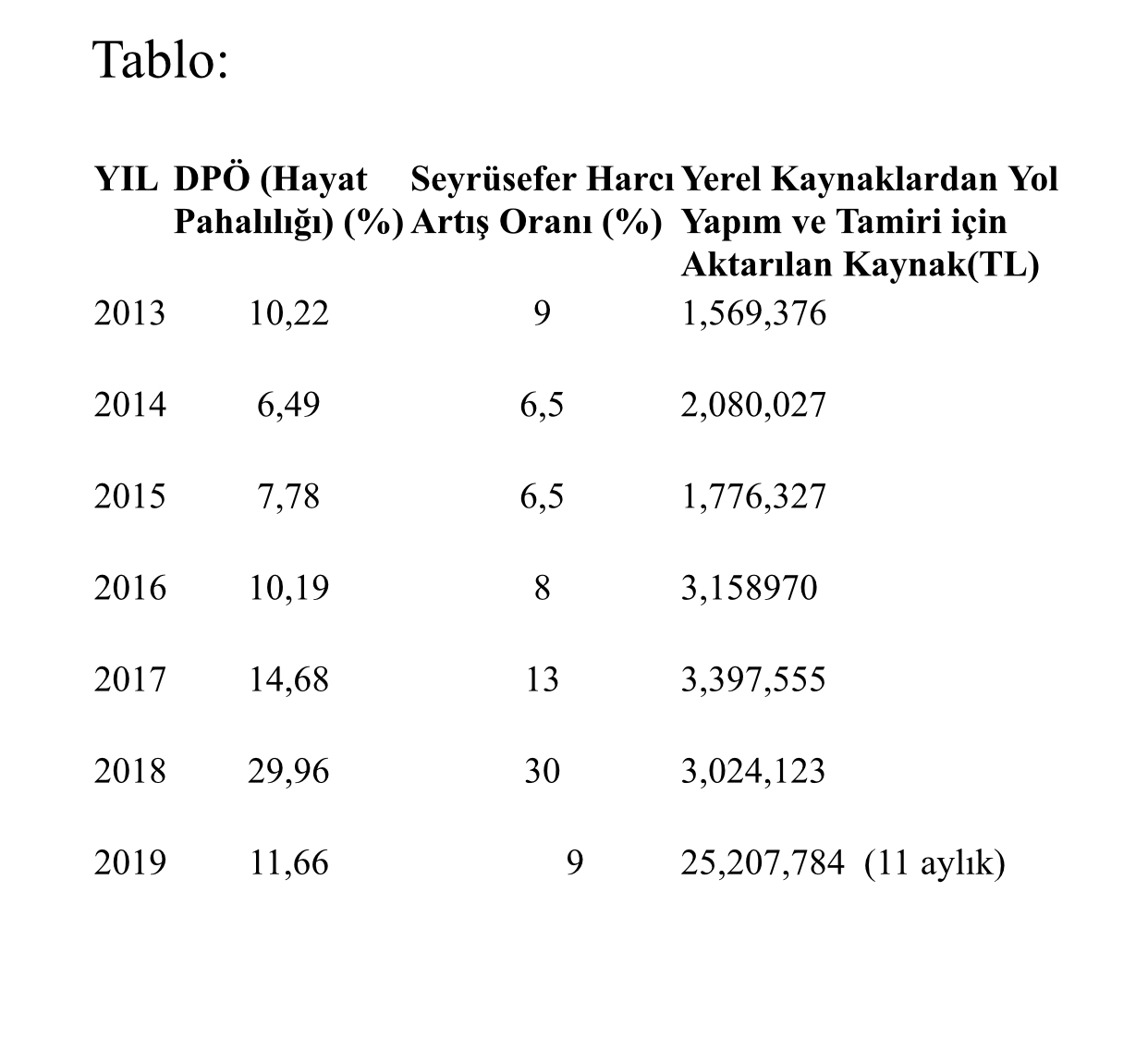 Maliye Bakanlığı açıklamasına göre, 2019’da hayat pahalılığı 11.66 oldu, seyrüsefer ücretlerine yüzde 9 zam yapıldı ve 11 aylık sürede yol yapımı ve tamirine yerel kaynaklardan 25 milyon 207 bin 784 TL aktarıldı.