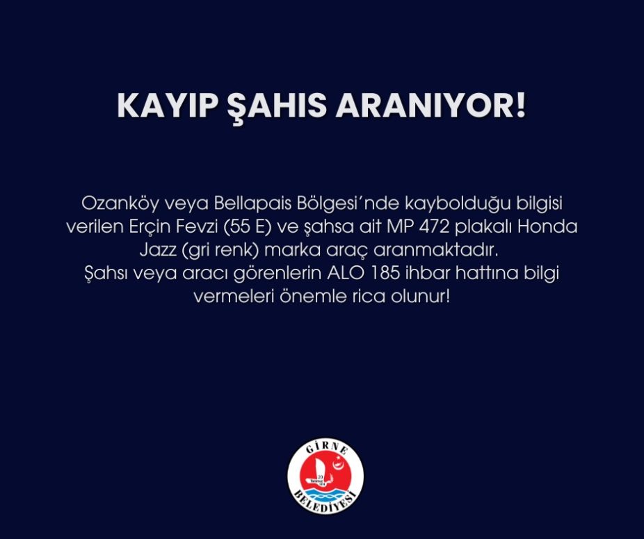Girne Belediye Başkanı Murat Şenkul kayıp olduğu düşünülen bir vatandaş için çağrı yaptı.